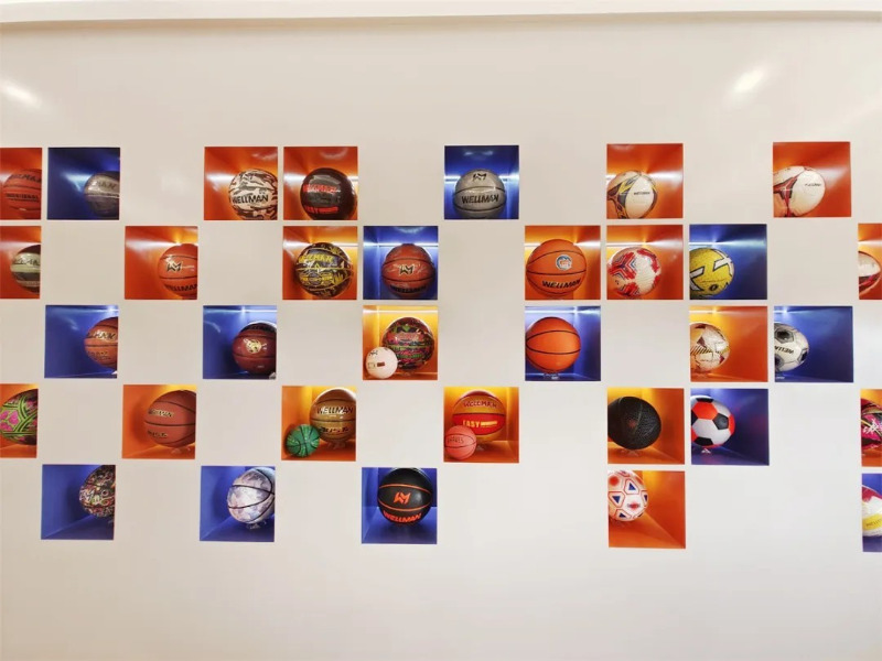 В выставочном зале продуктов Meidong Sports есть десятки баскетбольных, футбольных и волейбольных продуктов разных стилей и ярких цветов.